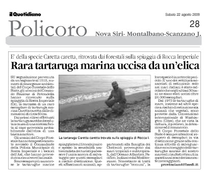 • P O L I C O R O. Una "tartaruga verde" nel mare di Policoro, poco distante dalla struttura del Circolo velico lucano. Ad avvistarla è stato Egidio Iannella, pescatore dilettante, alle prese con la pesca a poche decine di metri dalla riva. Ha pensato che si trattasse della solita tartaruga Caretta caretta, e vedendola in difficoltà, è riuscito a portarla a riva, e l'ha consegnata al Centro di recupero, posto nella struttura velica diSigismondo Mangialardi. Contrariamente a quello che era apparso a prima vista, si è avuta quasi subito la percezione di un eccezionale ritrovamento mai avvenuto prima sulle coste dello Jonio. Non era infatti una Caretta caretta, come si era pensato al primo impatto, ma un esemplare molto giovane di "Chelonia mydas", comunemente nota con il nome di "tartaruga verde", una tartaruga marina della famiglia Cheloniidae, che è molto rara nella nostra zona. Pesa 5 kg, misura 36 cm di lunghezza e 25 di larghezza.