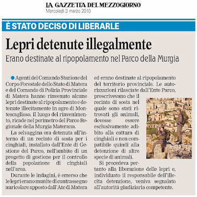 Ieri 23 marzo alle ore 18,20 circa è andato in onda su RAI 3 durante la trasmissione GEO & GEO il documentario naturalistico "Ali sopra le Murge" con la regia di Olivella Foresta. Un video della durata di 26 minuti girato la scorsa primavera ed estate che ha presentato gli aspetti più caratteristici della vita del Falco grillaio che vive tra Matera e Montescaglioso. Ma oltre alle immagini canoniche che mostrano gli aspetti e le abitudini più note del piccolo rapace mediterraneo sono stati illustrati altri momenti, alcuni inconsueti e suggestivi e più strettamente legati alla vita urbana e al rapporto, pacifico ed intimo, con gli abitanti. Il filmato ha evidenziato anche gli interventi che si sono realizzati per contribuire a mantenere su buoni livelli la popolazione locale, interventi nati e condotti nell'ambito del Progetto LIFE Natura "Rapaci Lucani" che la Commissione Europea e la Provincia di Matera hanno cogestito, con l'ausilio di esperti e collaboratori, tra il 2006 e il 2009. Si è parlato dei nidi artificiali installati sugli edifici di Matera e Montescaglioso e si è divulgata anche l'attività che svolge il Centro Recupero Rapaci che ha sede presso la Riserva Naturale di San Giuliano. Insomma un breve e ricco servizio sulla vita di questo straordinario e sempre più accettato coinquilino di materani e montesi.... Un modo semplice e colorito per dire che questo straordinario e sempre più minacciato falco merita davvero il nostro aiuto e il nostro rispetto in tutti i modi possibili.