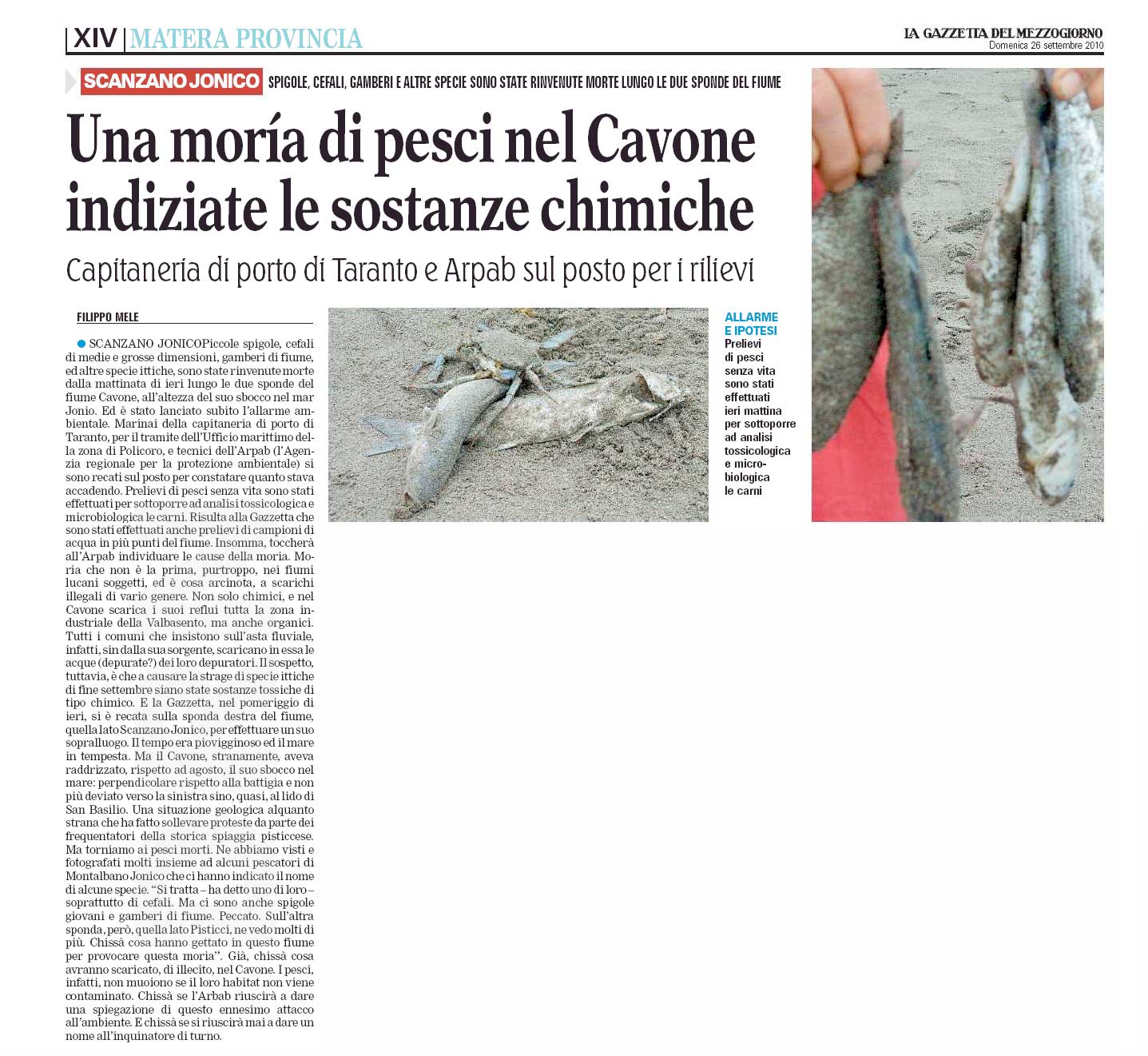 Dopo invasioni di campo da parte di qualche molecola cattiva, alcuni organismi acquatici muoiono subito, l'uomo più lentamente. Quasi non ce ne accorgiamo. Leggiamo di pesci morti o di granchi moribondi e pensiamo, in fondo in fondo, ma sì... sono solo pesci! Ma forse non abbiamo ancora capito che questi vertebrati ed invertebrati che popolano le nostre acque, apparentemente sporche o pulite che siano, sono i nostri campanelli di allarme. E che suonano il loro inno della morte o della sofferenza molto prima dei laboratori "ufficiali"... Scommettiamo? Fatte le analisi tutto tornerà come prima, come sempre. E i pesci torneranno a guizzare mentre noi aspetteremo la prossima scappatella delle solite molecole sfuggite ai soliti ignoti... Ma nei nostri organismi, sempre più fragili, esposti e indifesi, si fa sempre più strada l'esercito delle incognite e delle paure. Meditiamo...